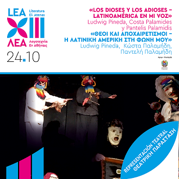 «Θεοί και αποχαιρετισμοί – Η Λατινική Αμερική στη φωνή μου». Μουσικό-Θεατρική Παράσταση για δύο ηθοποιούς και έναν συνθέτη, με τους Ludwig Pineda, Κώστα Παλαμήδη, Παντελή Παλαμήδη.