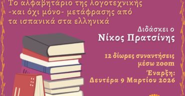 Το αλφαβητάρι της μετάφρασης από τα ισπανικά στα ελληνικά Διδάσκει ο Νίκος Πρατσίνης «Τι διδάσκεται» σε αυτό το Σεμινάριο; α) Η άσκηση της «φυσικής» ικανότητας που αναπτύσσει κάθε ξενόγλωσσος στη μετάφραση, με κατεύθυνση και απώτερο στόχο μια ενδεχόμενη επαγγελματοποίηση. Προφανώς, ένα σεμινάριο 12 μαθημάτων (12 δίωρων) δεν μπορεί να αντικαταστήσει το πρόγραμμα σπουδών μιας σχολής ή ενός πανεπιστημιακού τμήματος μετάφρασης, ανοίγει όμως δρόμους και βοηθά […]