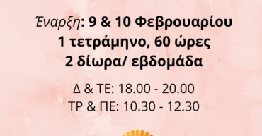 Έναρξη: Φεβρουάριος 2026 ΜΑΘΗΜΑΤΑ για αρχάριους – A1 2 δίωρα /εβδομάδα Τρίτη & Πέμπτη 10.30 – 12.30 Δευτέρα & Τετάρτη 18.00 – 20.00 ⇒2 δίωρα την εβδομάδα -ONLINE (μέσω της πλατφόρμας ZOOM) -1 τετράμηνο -Συνολικές ώρες τετραμήνου: 60 ώρες -Δίδακτρα τετράμηνου: 395€ ♦Ειδική τιμή για φοιτητές και παλιούς σπουδαστές μας: 345€ -Ο σπουδαστής μπορεί […]
