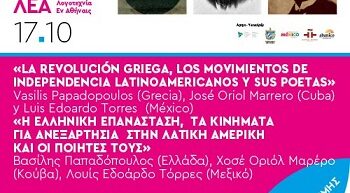XIII FESTIVAL LEA ΦΟΡΟΣ ΤΙΜΗΣ | Η Ελληνική Επανάσταση, τα κινήματα για ανεξαρτησία στην Λατική Αμερική και οι ποιητές τους Κυριακή 17 Οκτωβρίου, 2021 7:00 μμ – 8:00 μμ KΠΙΣΝ – ΦΑΡΟΣ 19.00 h Με αφορμή τη διακοσιετηρίδα της Ελληνικής Επανάστασης και την ανεξαρτησία πολλών χωρών της Λατινικής Αμερικής, ο Έλληνας συγγραφέας Βασίλης Παπαδόπουλος, ο Κουβανός διπλωμάτης […]