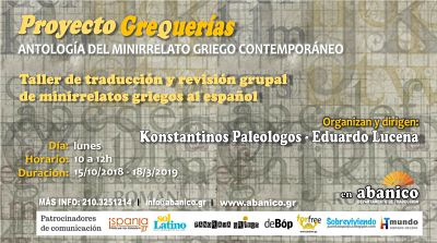 La minificción griega gana cada día nuevos adeptos en nuestro país, pero permanece prácticamente desconocida fuera de nuestras fronteras lingüísticas. Con el taller de traducción y revisión grupal: «Proyecto: Minigrequerías». Αntología del minirrelato griego, aspiramos a reunir en español un número suficiente de minirrelatos de autores griegos contemporáneos para una antología que se publicará por la editorial malagueña E.D.A. Libros en 2020.